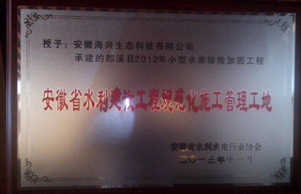 2014年03月24日,安徽省水利水電行業協會傳來喜訊,我公司承建的郎溪縣2012年小型水庫除險加固工程榮獲“安徽省水利建設工程規范化施工管理工地”稱號。