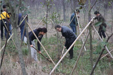 來到了栽樹片域,曹成年總經理熱忱的歡迎我們的到來。他首先簡明扼要教我們如何栽樹:第一,將樹苗扶正放入坑中,將樹根面與地面平齊,如果地面比樹根面低,則需將坑再挖深一點。如果地面比樹根面高,則可將坑底用土墊高點。第二,將土鏟入坑中后,要用腳踩實。第三,再用土在樹根周圍培個小“圍堰”,以便澆水不流走。學習完之后,大家心情澎湃,每兩人一組開始栽樹,你扶樹來,我拿鍬,你超我趕,不僅比栽樹的速度,更比栽樹的質量。雖然天氣陰冷,但抵擋不住我們的熱情,不一會,我們就冒汗了。栽的快的一組,幫助慢的一組。經過近3個小時的奮戰,終于將我們的任務完成,放眼望去,我們載的樹,像軍人一樣昂首挺胸的屹立成行,大家心里很是自豪啊。