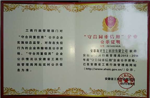 在2013-2014年度省工商局“守合同重信用”單位評選中,我公司再次獲此殊榮。