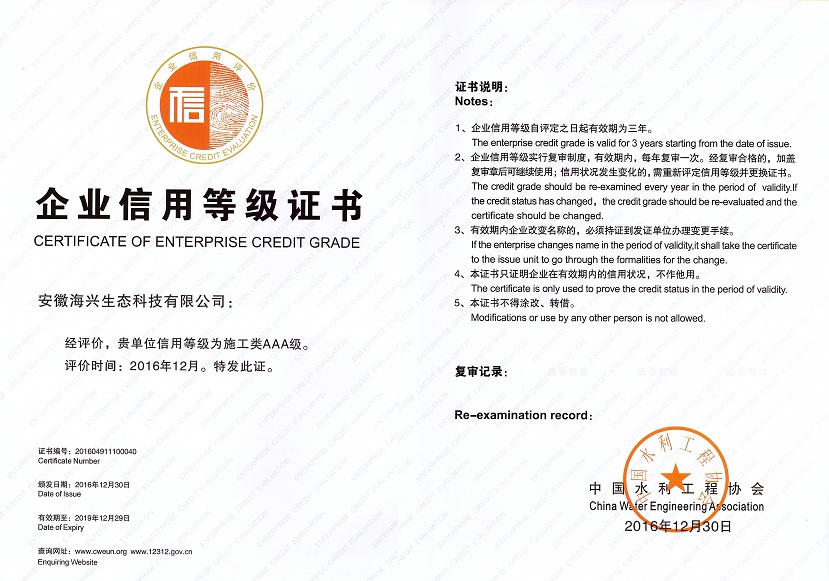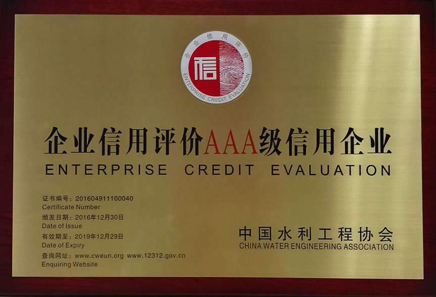 近日,中國水利部關于水利建設市場主體信用評價證書公開頒發,我公司榮獲“AAA級信用企業”榮譽。此次評審,安徽省僅有五家企業獲得了該項榮譽。