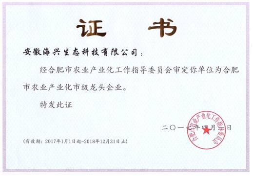 近日,我公司再次被合肥市農業產業化工作指導委員會評定為合肥市農業產業化市級龍頭企業。