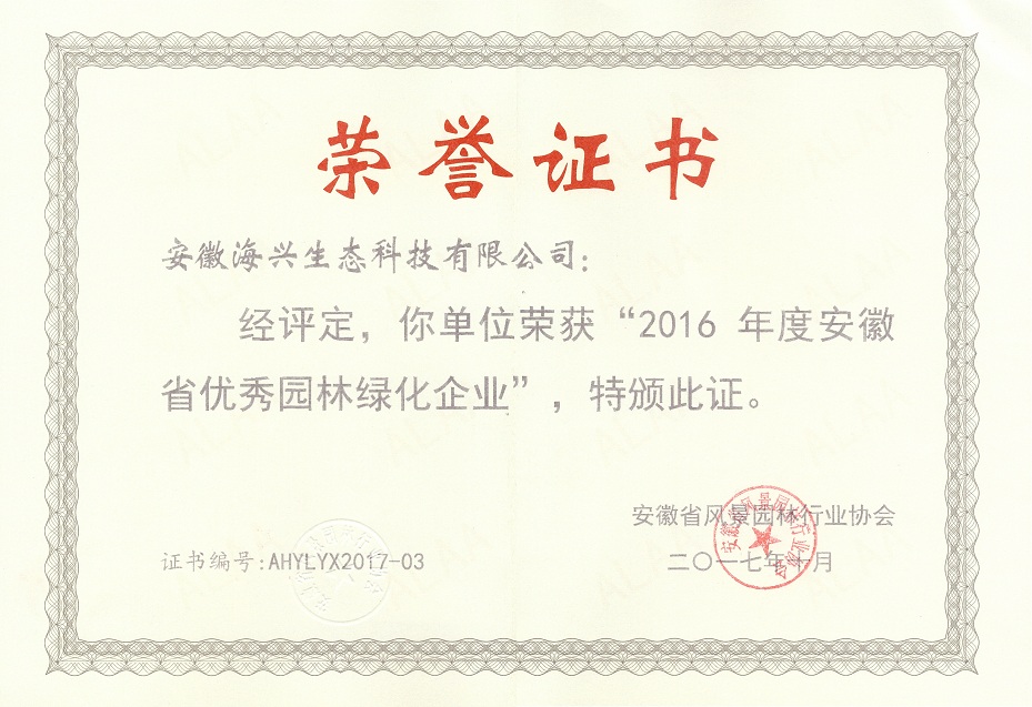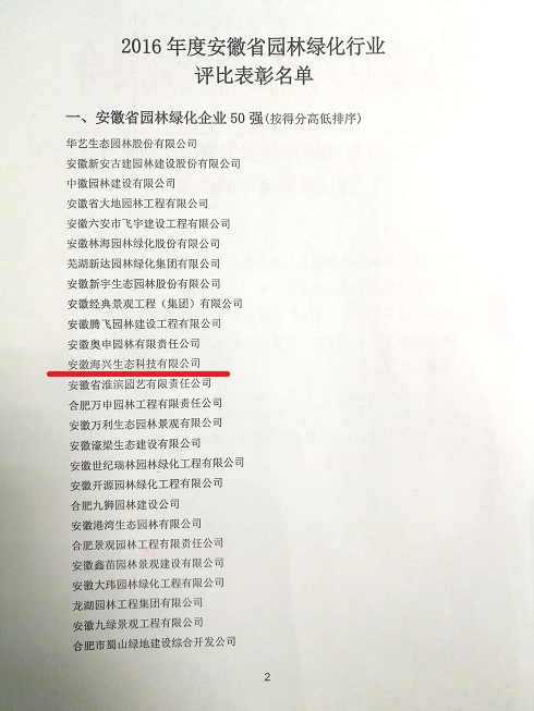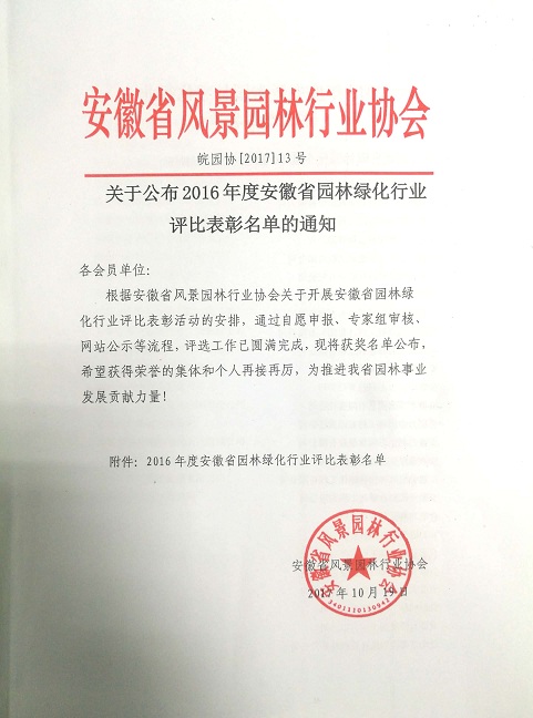 近日,安徽省風(fēng)景園林行業(yè)協(xié)會組織開展了首屆省園林綠化行業(yè)評比表彰會,并揭曉了2016年度“園林綠化企業(yè)50強(qiáng)”“優(yōu)秀園林綠化企業(yè)”等多項榮譽(yù)獲得者。祝賀我公司獲得“園林綠化企業(yè)50強(qiáng)”“優(yōu)秀園林企業(yè)”雙項榮譽(yù)。