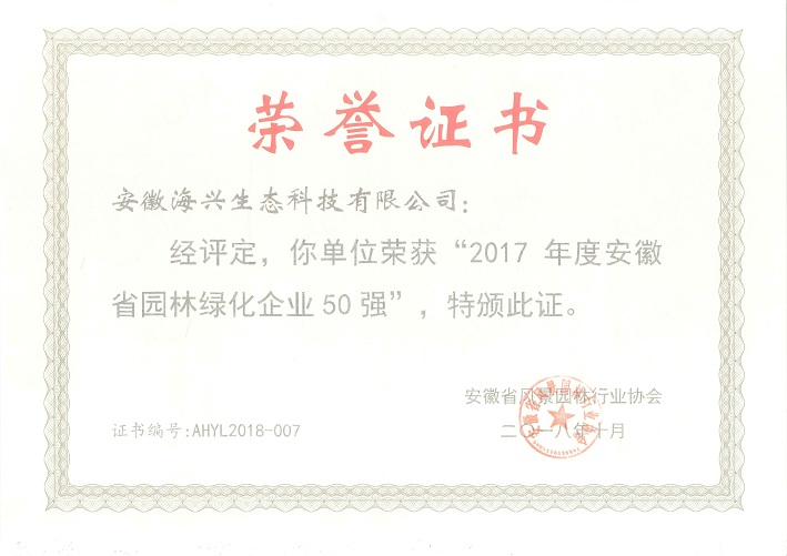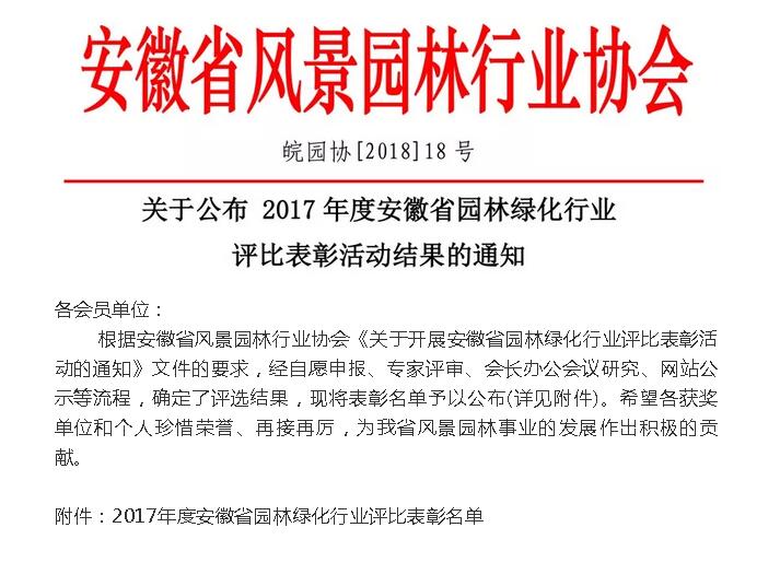 近日,安徽省風景園林行業協會公布了“2017年度安徽省園林綠化行業評比表彰活動結果的通知”(皖園協【2018】18號),經評委會專家層層評比、會長辦公會議研究決定,我公司再獲“安徽省園林綠化企業50強”、“安徽省優秀園林綠化企業”榮譽稱號。