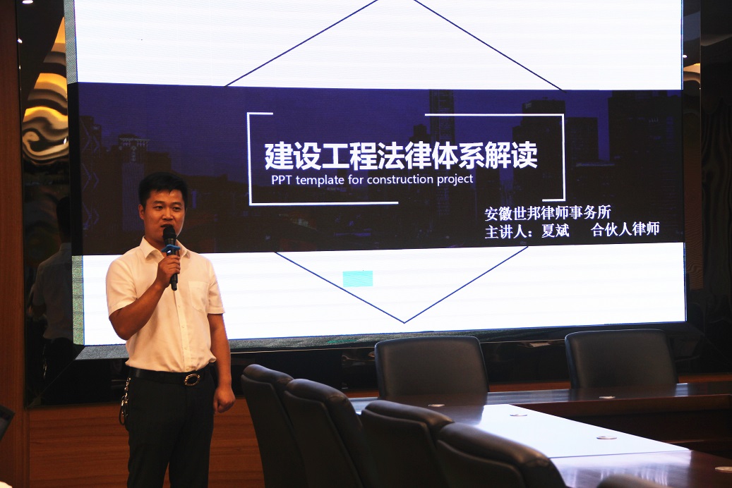 本次培訓《建設工程法律體系解讀》為主題,由安徽世邦律師事務所夏斌律師主講。夏律師結合當下施工企業現狀、現場解讀有關法律法規、法院裁判規則,結合自己代理的案例分析其產生的原因并總結經驗,系統的講解了目前施工企業存在的法律風險及防控措施。在隨后的交流環節中,夏律師從法律層面逐一解答了公司各板塊及項目負責人目前存在的法律困惑和問題,為我們提供了富有成效的解決思路和方案,現場氣氛活躍,效果良好。