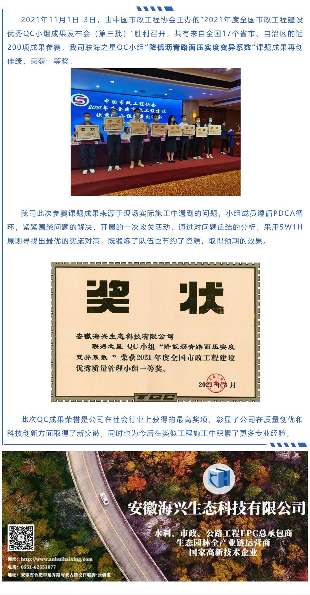 賀我司獲全國市政工程建設QC小組活動一等獎
