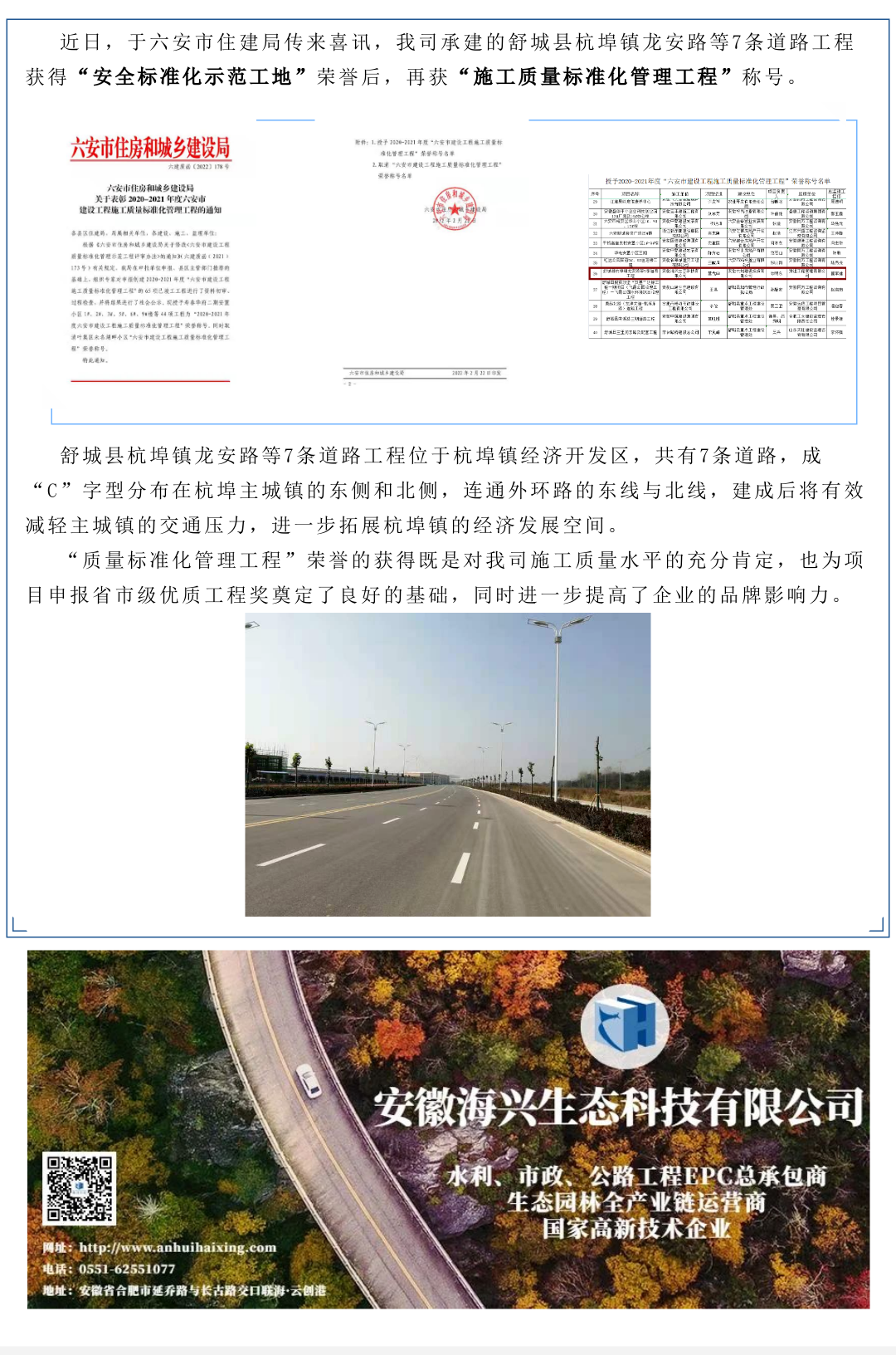舒城縣杭埠鎮龍安路等7條道路工程 喜獲市級“施工質量標準化管理工程”稱號
